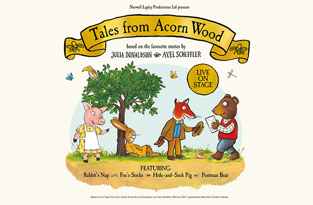 Julia Donaldson and Axel Scheffler’s beloved Tales from Acorn Wood stories are brought to life on stage for the first time in an enchanting lift-the-flap experience. Poor old Fox has lost his socks! Are they in the kitchen or inside the clock? And Rat-atat-tat! Who’s that keeping tired Rabbit awake? You can also join in with Pig and Hen’s game of hide-and-seek and discover the special surprise Postman Bear is planning for his friends.